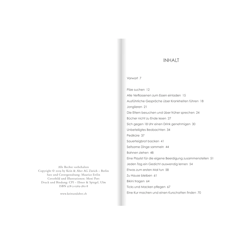 Andrea Gerk zeigt, wie viele wunderbare Kleinigkeiten das Leben bereithält, wenn man erst einmal die nötige Reife besitzt, um sie überhaupt zu erkennen: Pilze suchen, die eigenen Ticks und Macken pflegen, Vögel beobachten, die Verflossenen zum Essen einladen, Sauerteigbrot backen, mal wieder eine rauchen, eine Playlist für die eigene Beerdigung zusammenstellen, Kopfstand üben.