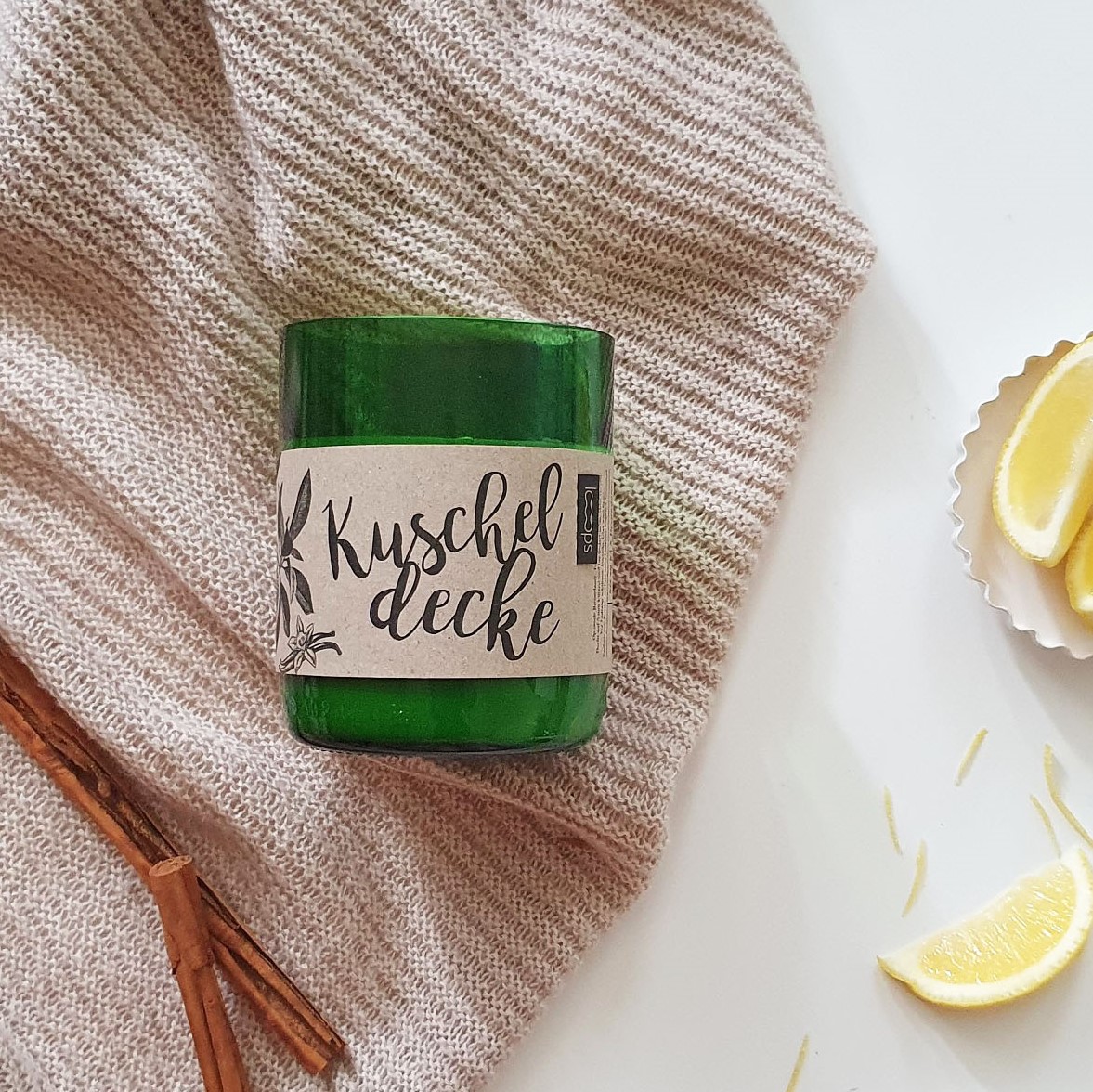 Die Kerzen werden in liebevoller Handarbeit in einer Manufaktur aus rein pflanzlichem Wachs und 100% naturreinen ätherischen Ölen hergestellt. Für die Gläser werden recycelte Weinflaschen verwendet.
